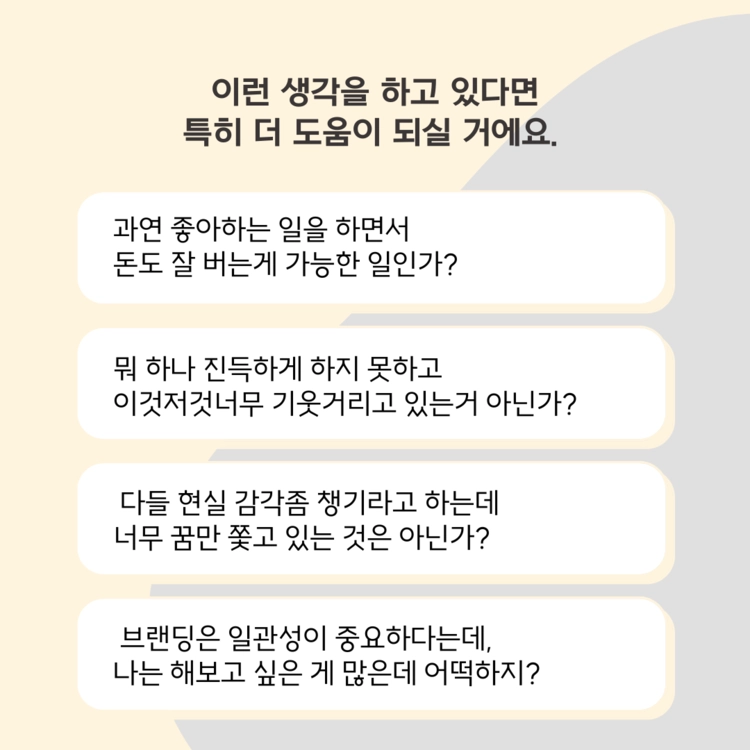 - 좋아하는 일로 돈버는 것이 막연합니다. 시작과 함께 버티는 법도 알려주세요!